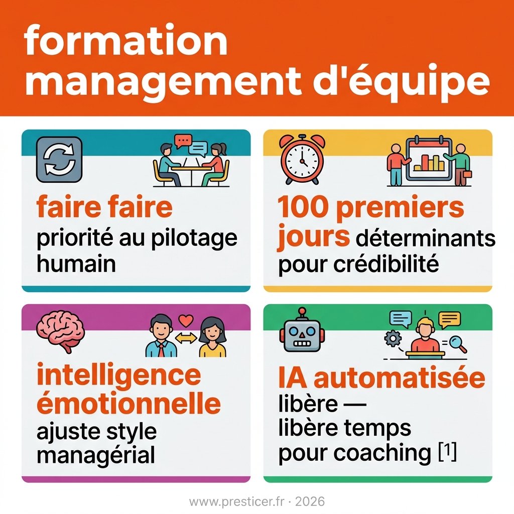 - Une formation management d’équipe certifiée Qualiopi couvre leadership, gestion des conflits, management hybride et intégration de l’IA.